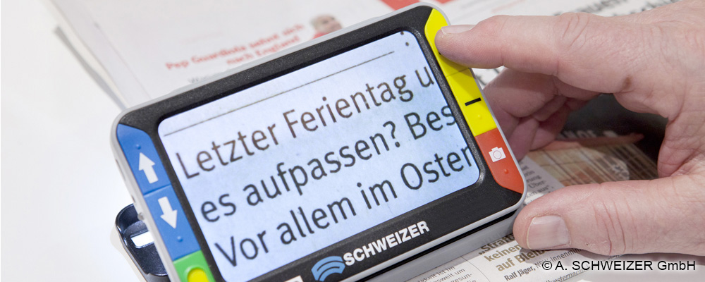 dieser Geräte ist, dass sie den Kontrast verstärken und dass die Vergrößerung den aktuellen Bedürfnissen des sehbehinderten Menschen individuell angepasst werden kann.